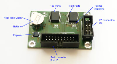 Diese Platine basiert auf der I²C Expanderplatine P018, wird hier jedoch lediglich mit der Echtzeituhr und einem Wannenstecker geliefert (also keine I²C Portexpander-Chips). Das Foto entspricht also nicht genau dem Lieferzustand, da hier auch noch die I²C Expanderbausteine mit abgebildet sind.