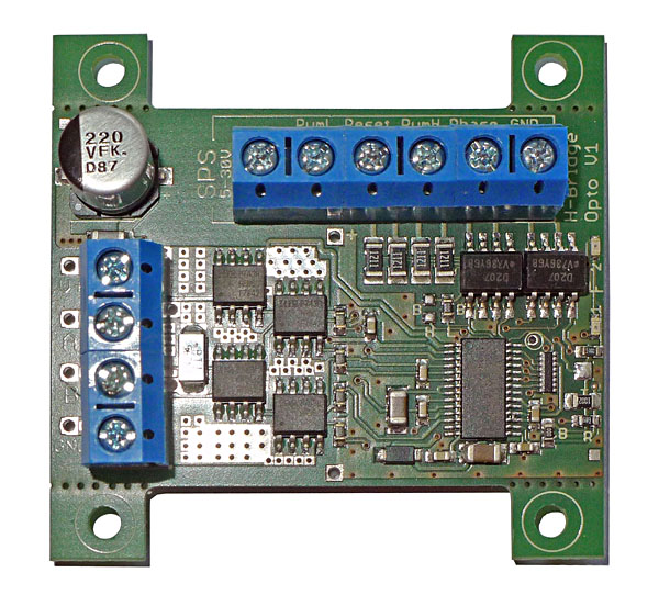 Optokoppler-Eingänge: Sämtliche Eingänge sind per Optokoppler entkoppelt, so dass Sie die H-Brücke sowohl per Schalter/Taster aber auch per Mikrocontroller oder per SPS ansteuern können. Die Logik-Eingangsignale dürfen zwischen 1,8V und 24V liegen.