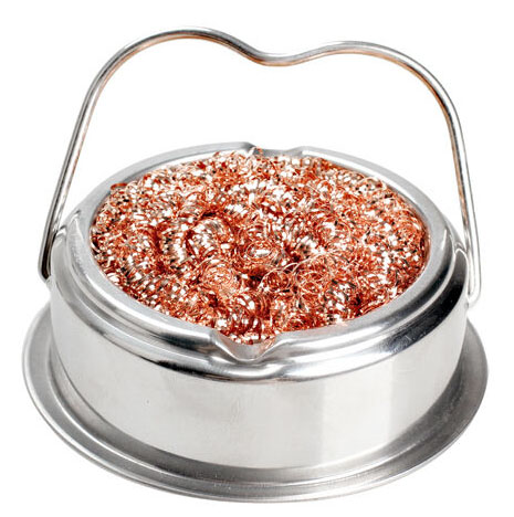 Profis verzichten auf einen feuchten Schwamm (übrigens ein idealer Brutplatz für Bakterien aller Art) und benutzen einen Abstreifer mit Metallgewebe. Wichtig ist hier, dass das Material des Abstreifmetalls weicher als die üblicherweise eisenplattierte Lötspitze ist. Unser Abstreifer kommt mit einem feinem Bronzegewebe in einem schweren Tischständer und rutschfestem Gummisockel. Der Vorteil: nie wieder anfeuchten; der Lötkolben wird hervorragend gereinigt (besser als am Schwamm) und kühlt nicht aus. Da Bronze weicher als Eisen ist, wird die Lötzspitze nicht beschädigt und hält viel länger als sie bei herkömmlicher Reinigung halten würde. Bei den Preisen von Lötspitzen, armortisiert sich dieser Abstreifer im Handumdrehen.