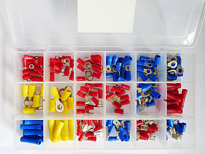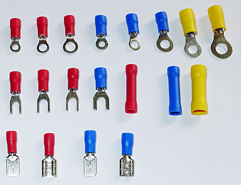 Das Set besteht aus Ring-Kabelschuhen, Gabel-Kabelschuhen, Flachsteckern, Flachsteckhülsen und Quetschverbindern in den gängigsten Größen,