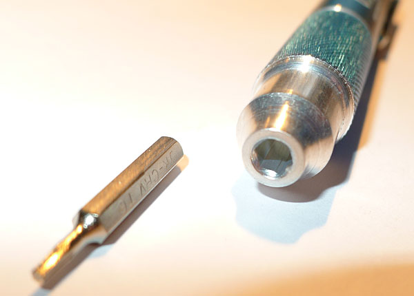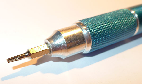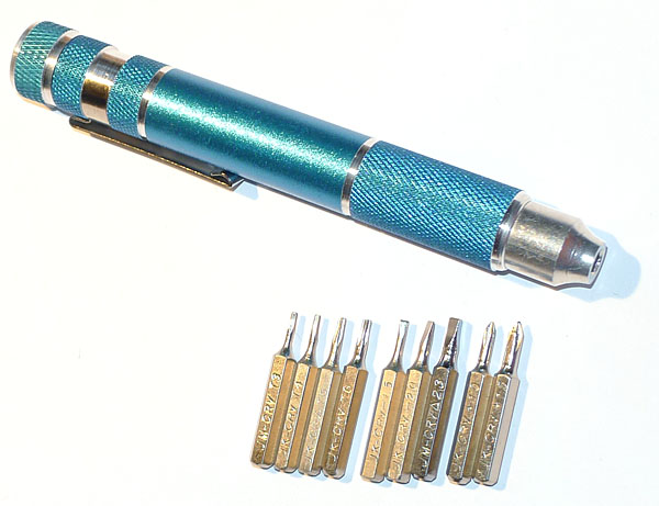 Dieses Werkzeug sollte man immer griffbereit haben - z.B. in der Schreibtischschublade. Damit ist jedes Kleingerät im Nu geöffnet - ohne erst groß nach dem 'großen' Schraubenziehersatz suchen zu müssen bzw. ihn aus der Werkstatt holen zu müssen. Neun Werkzeugspitzen erlauben die Demontage/Montage bzw. das Öffnen von elektronischen Geräten jederzeit und an jedem Ort. Alle neun Einsätze finden bei Nichtbenutzung im Körper des Werkzeugs Platz (Herausnahme durch Abschrauben der oberen Aluminiumkappe - siehe Foto unten). Der praktische Clip kann zur Befestigung (z.B. Hemdtasche) genutzt, aber auch abgenommen werden.